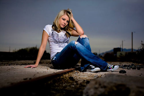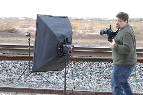 Jim used his softbox, AB800’s and a Vagabond to set this shot up on the tracks.