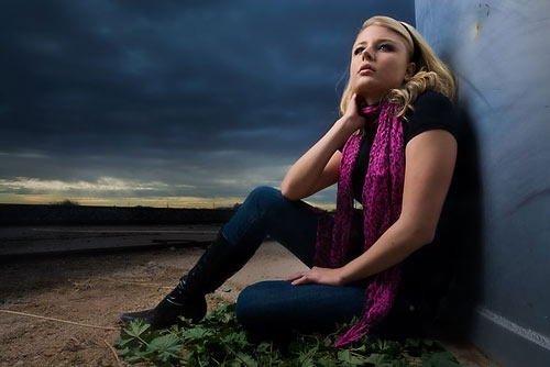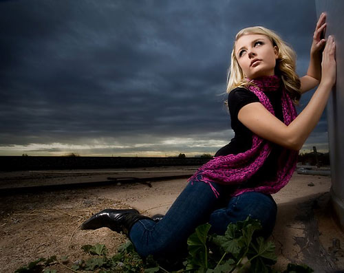 Keeping the softbox for his main light, Jim wanted the ambient light to be darker and moody. Here the ambient is two stops less than the exposure for the softbox and speedlight combination. Jim metered the ambient, tested a few shots to make sure that two stops under would be the look he wanted in the sky and the surroundings and then built his light to give him the exposure on Christina of two stops brighter… choosing that combination for his shot.