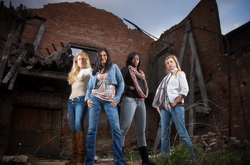This was the last shot of the day on Sunday. We had dealt with rain and wind and cold. But everyone was in great spirits so we took the four models for one more shot in the ‘ruins.’ We decided they looked like a rock band so that was kind of the theme.